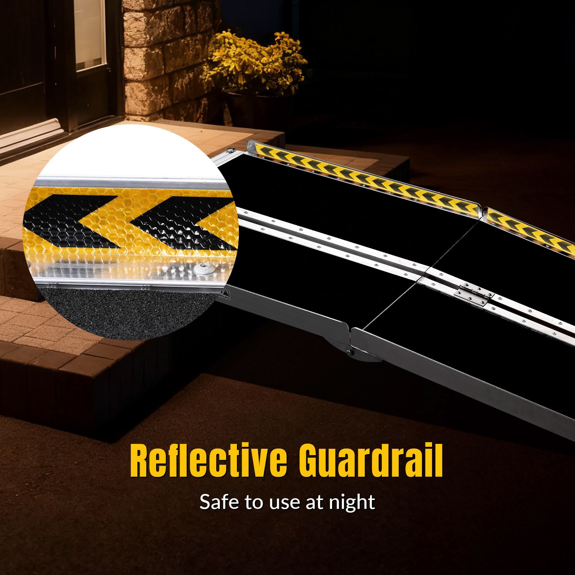 - Reflective Guardrail - Features safety guardrails on both sides to prevent the wheelchair from accidentally sliding off the ramp. Bright yellow warning signs posted on 2 sides make it clearly visible at night